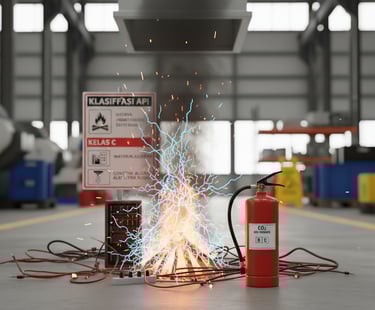 Kebakaran yang melibatkan peralatan listrik bertegangan, seperti konsleting, kebocoran listrik, dan kerusakan jaringan kabel.